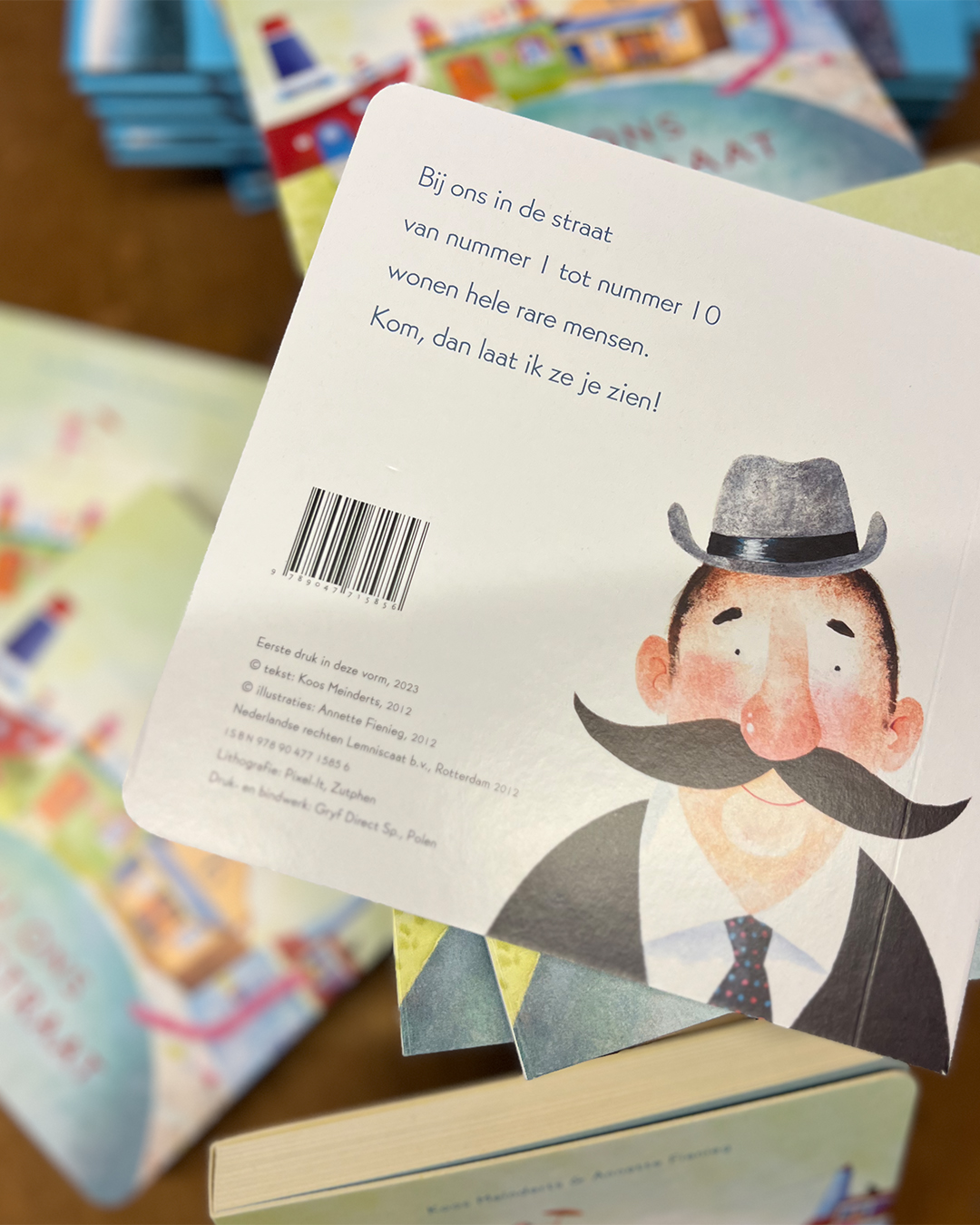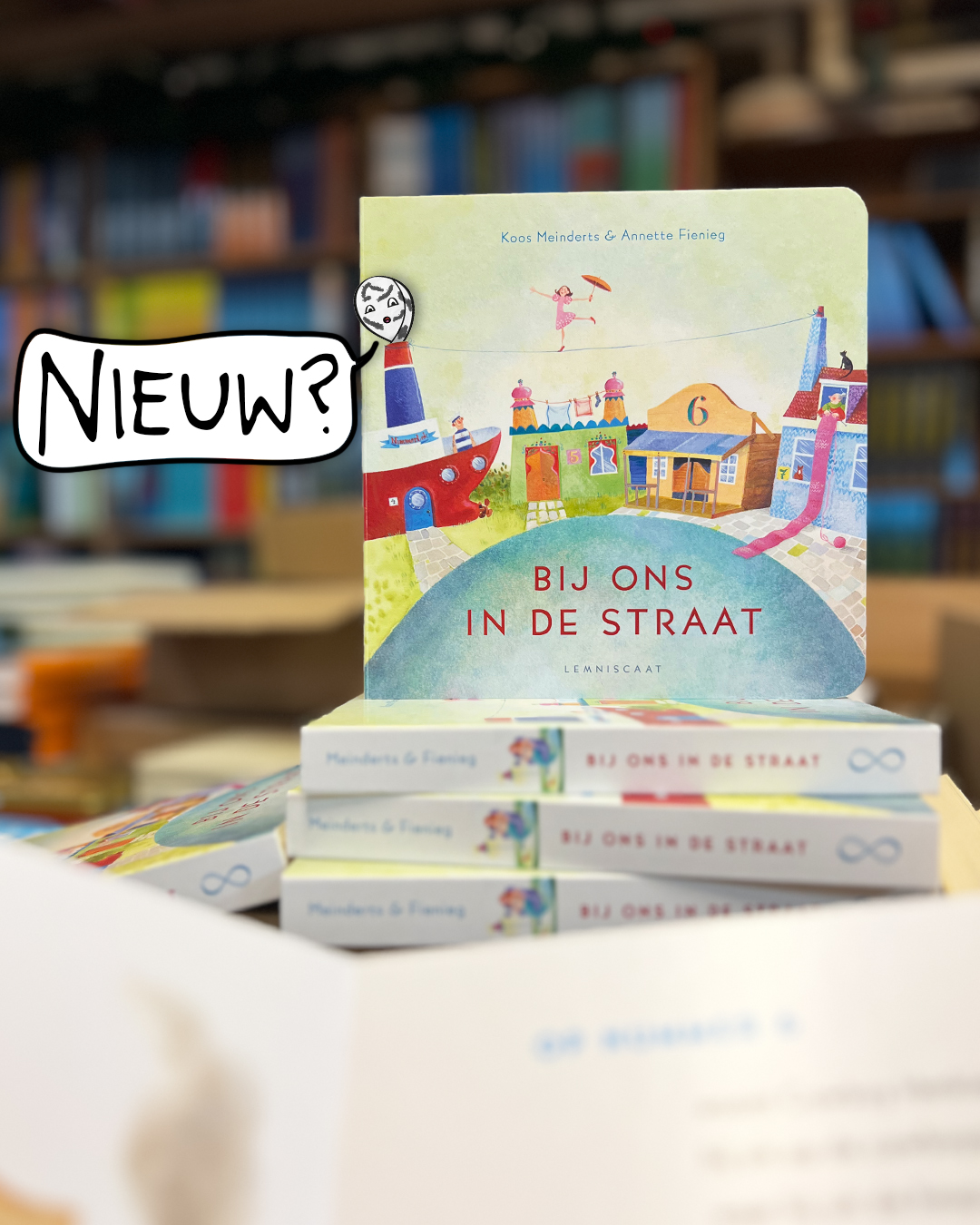In Bij ons in de straat stellen Koos Meinderts en Annette Fienieg hun buren aan je voor: Tante Truitje, Cowboy Henkie, Kleine Jantje Hens aan Dek en nog zeven anderen. En op nummer elf? Daar wonen ze zelf. Een feestelijk en onverwoestbaar prentenboek vol vrolijke figuren.