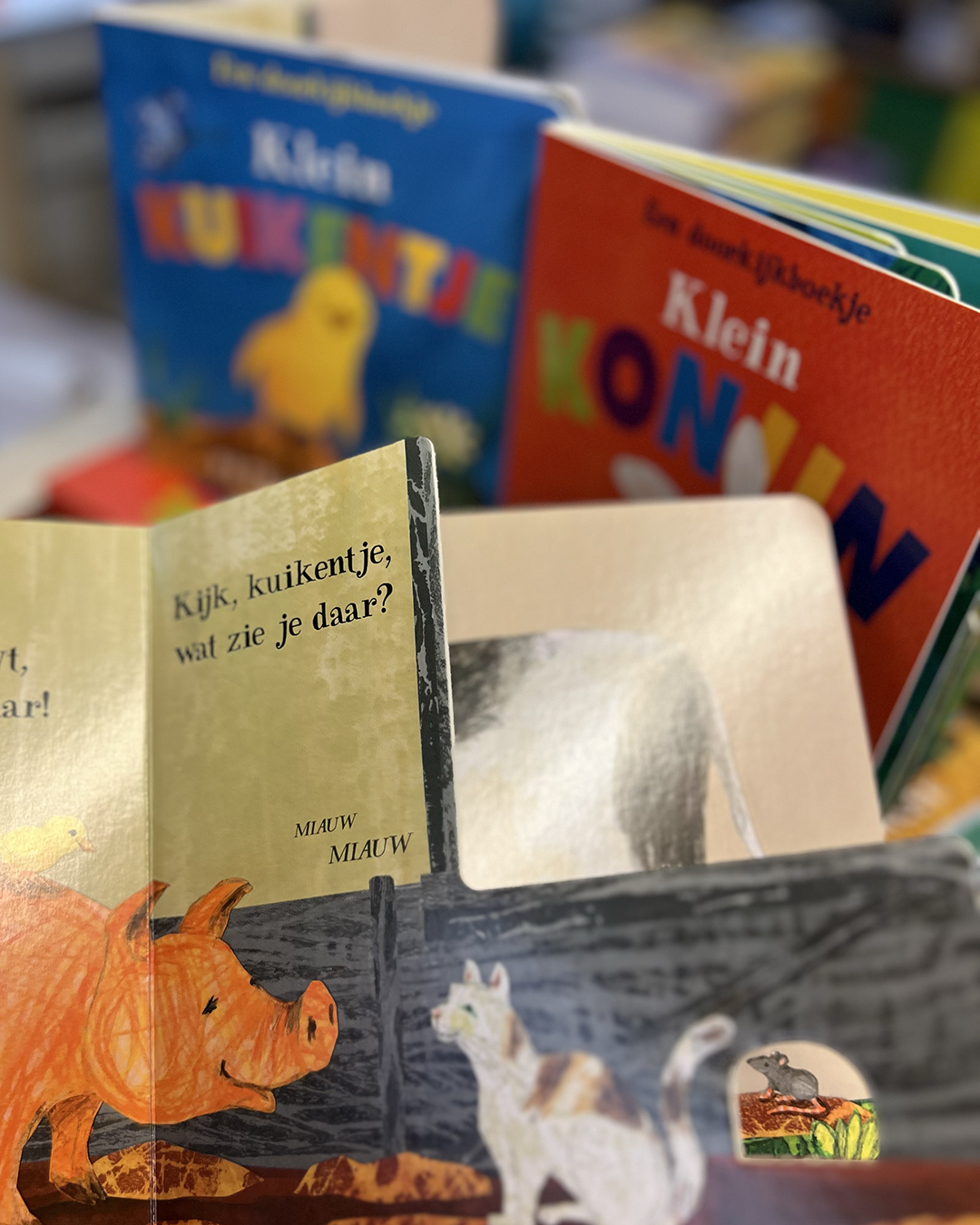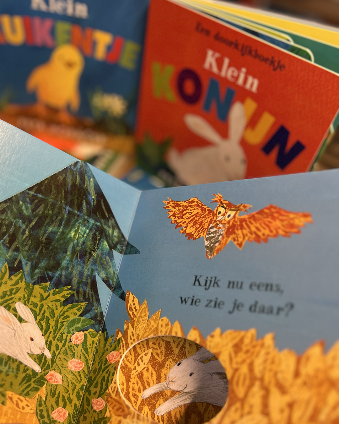 Ga mee met klein kuikentje en kijk door de gaatjes in het karton om allerlei dieren te bekijken. Lees met je kleintje en maak samen de geluiden van de dieren.