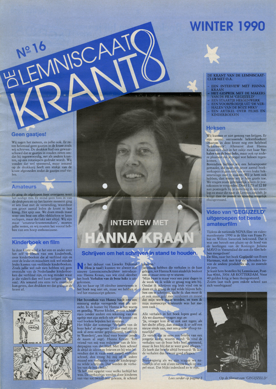 Lemniscaat verwelkomt met een interview een nieuwe auteur, Hanna Kraan. Op dat moment weten we nog niet hoe tijdloos De boze heks zal gaan worden. Verder is er een column te lezen, gaat het over de verfilming van Evert Hartmans Gegijzeld en natuurlijk zijn er leesfragmenten. En dan hebben we nog een kerstverhaal voor je, staan we stil bij het overlijden van Roald Dahl en… Weet je, ga lekker zelf lezen in de nieuwe oude Lemniscaatkrant!