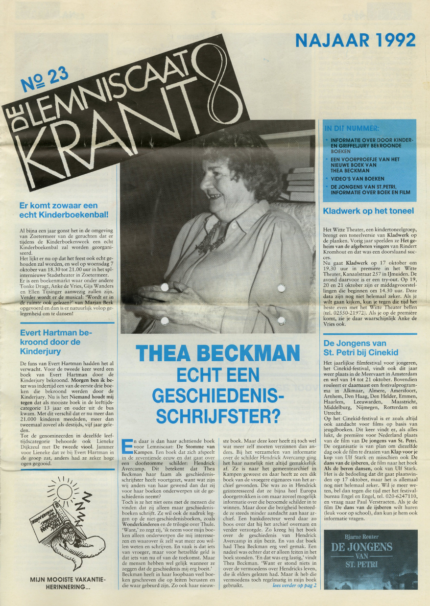 Ondertussen is in nummer 23 uit het najaar van 1992 te lezen dat er een kinderboekenbal komt. En wat de favorieten boeken zijn van een redactielid. Een leesfragment uit het nieuwe boek van Thea Beckman De Stomme van Kampen. Maar ook een interview met Jacques Vriens. Benieuwd naar de bekroningen van de Kinderjury ‘92? Staat er ook in.