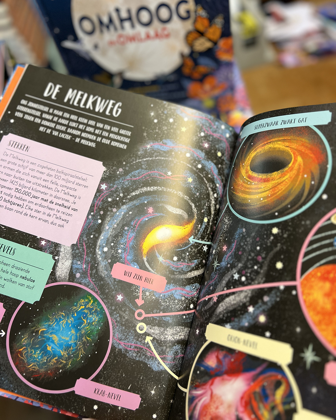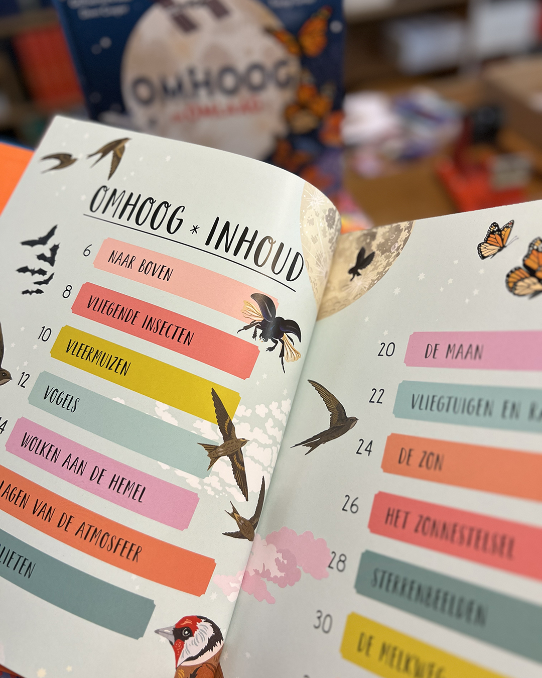 Reis mee naar bergtoppen, langs de wolken omhoog naar waar vliegtuigen vliegen, ontmoet vogels, insecten en fladderende vleermuizen. Vergeet je ruimtepak niet, want we zullen algauw de atmosfeer van de aarde verlaten, langs raketten en satellieten schieten en het zonnestelsel bezoeken. En dan gaan we nog hoger… en leer je ons sterrenstelsel kennen en neem je een kijkje in het heelal.