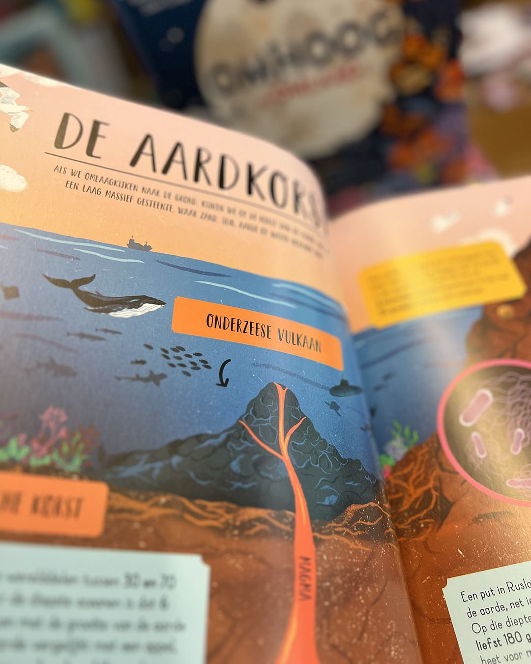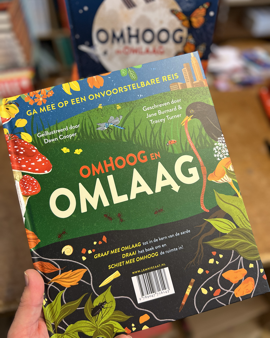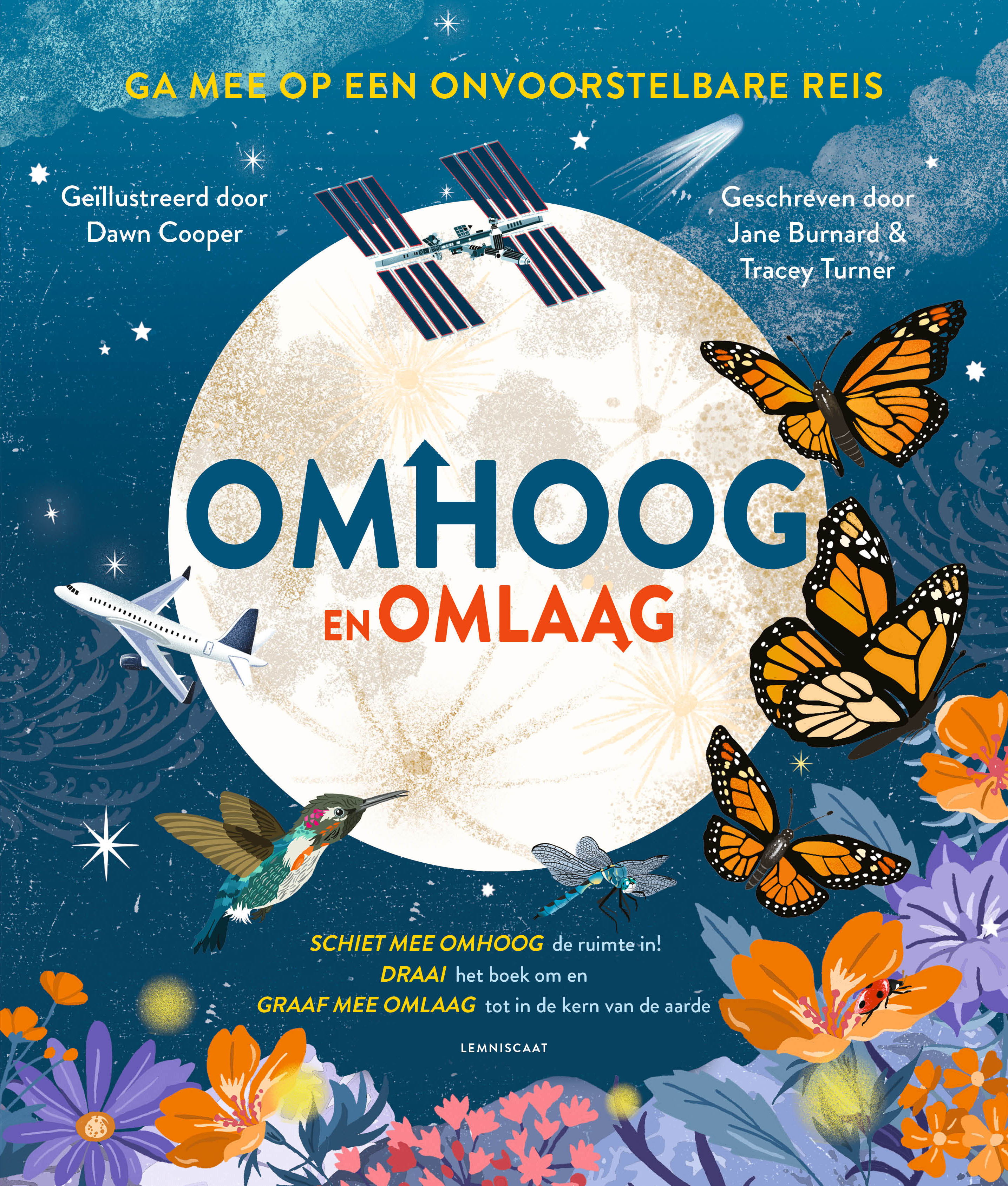 En als je het heelal hebt verkend, draai je het boek gewoon om! Reis mee tot ver onder de straten van een stad en langs de ondergrondse woningen van diverse dieren. Ontdek diepe, donkere grotten, vurige vulkanen en (meer dan) kokendhete onderwaterbronnen en ontmoet gigantische kokerwormen en Yeti-krabben. Uiteindelijk komen we aan in de kern van de aardbol, waar het bijna net zo heet is als op het oppervlak van de zon, maar waar de sleutel tot alle leven op aarde te vinden is.