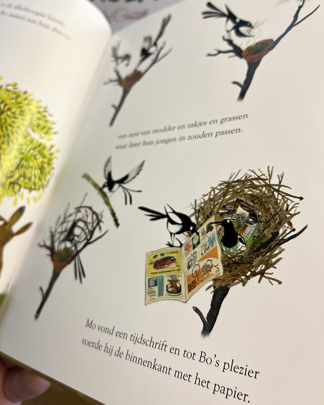 Terwijl Mo en Bo een prachtig nest voor hun eitjes maken, raken ze ervan overtuigd dat ze meer spullen nodig hebben. Hun jongen verdienen straks het beste van het beste, dus ze halen van alles naar boven, van klokken en sokken tot een kinderwagen, fietsen en zelfs een auto!